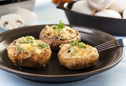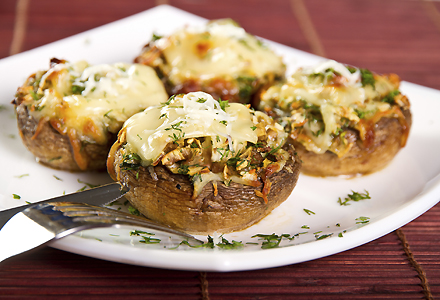 Serveste aceste ciuperci umplute cu cascaval, facute la cuptor, alaturi de o salata verde dreasa cu zeama de lamaie si ulei de masline.